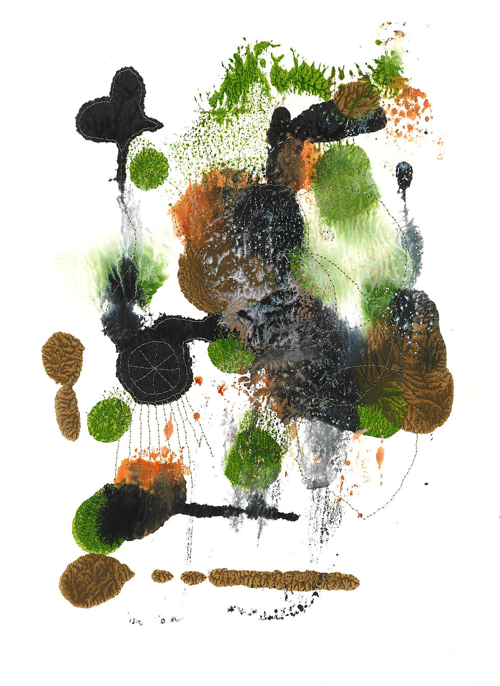 Original embroidery on paper, where acrylic painting meets hand-stitched thread. A practice of bringing two languages together — the soft surface of colour and the precise mark of the needle. Each work is unique, signed, and one of a kind.